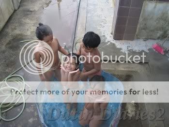 ok berbalik pada cerita anak2 lah ye..aku bangun je tidur anak2 aku dok main kolam buatan tangan sendiri..hehhee..yelah kat rumah KB ni rumah aku mana ada pool..kalau anak sungai adalah..tapi jgn haraplah aku nak bagi anak2 aku mandi sungai...bahaya woooo...sekarang musim hujan..kalau setakat mandi kolam buatan tangan tu tak jadi masalah la..mak aku memang dok pantau la anak2 aku main..manakala aku plak sibuk dok ngambik gambar anak2 lah kerjanya.apa yg penting adalah aku happy bila tgk anak2 aku happy..